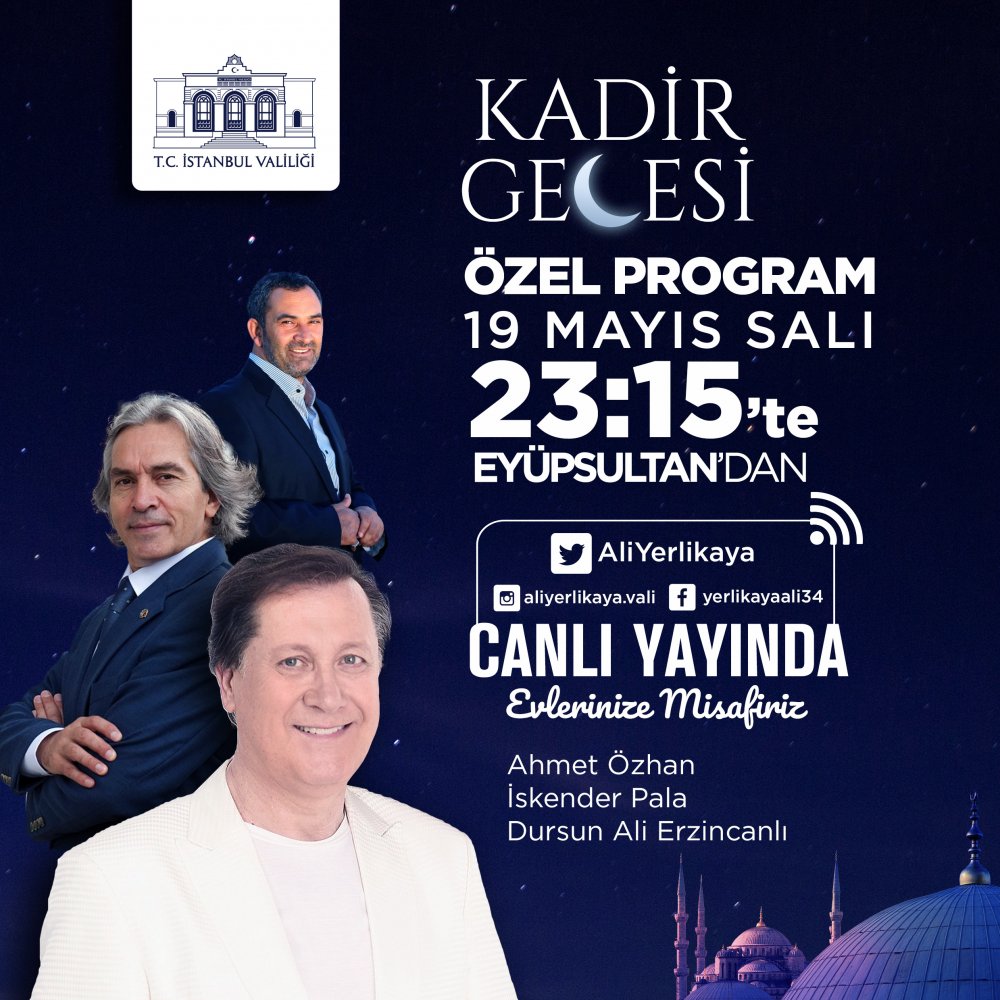 Kadir Gecemizi en güzel şekilde eda etmek için Valilik olarak özel bir program hazırladık. Kıymetli Sanatçılarımız Ahmet Özhan ve Dursun Ali Erzincanlı ile Tarihçi Yazar İskender Pala Hocamızla birlikte Eyüpsultan Meydanı’ndan İstanbullulara seslenecek, bu geceyi hep birlikte eda edeceğiz.