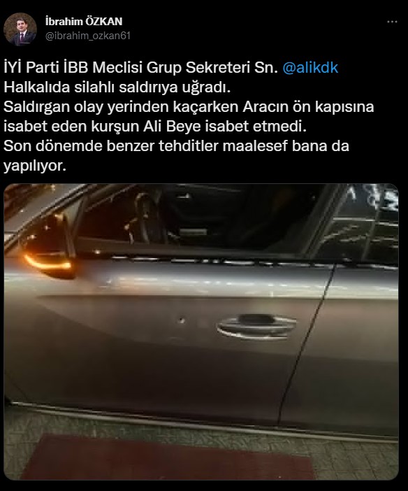 Özkan; "Saldırgan olay yerinden kaçarken aracın ön kapısına isabet eden kurşun Ali Bey'e isabet etmedi. Son dönemde benzer tehditler maalesef bana da yapılıyor" dedi.