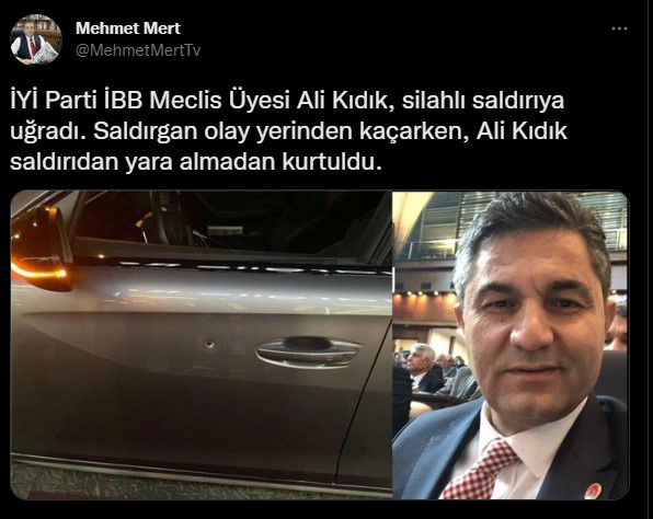 İstanbul Büyükşehir Belediyesi İYİ Parti Meclis Üyesi Ali Kıdık, Halkalı'da silahlı saldırıya uğradı.Saldırgan olay yerinden kaçarken, Ali Kıdık saldırıdan yara almadan kurtuldu.