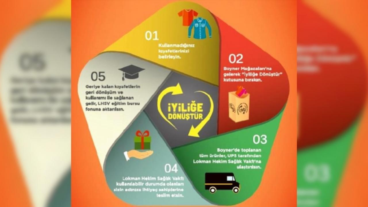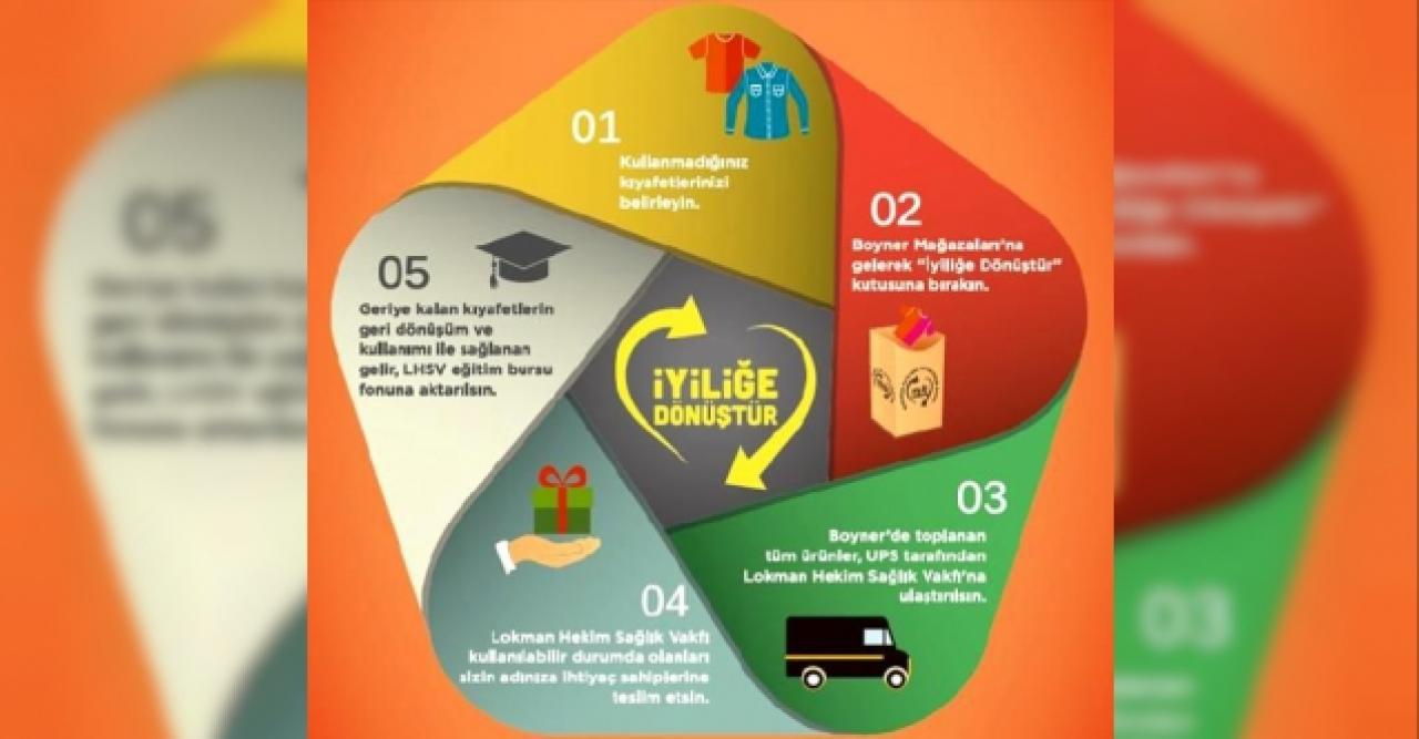 Projeyle, kullanılmayan tekstil ürünlerinin yeniden değerlendirilmesini amaçlıyor. Tüketiciler kullanmadıkları, ihtiyaç duymadıkları tekstil ürünlerini Boyner mağazalarında bulunan geri dönüşüm kutularına bırakıyor. Toplanan kıyafetler; geri dönüşüm, geri örüşüm ve yeniden kullanım olarak 3 ayrı kategoride ayrıştırılıyor. Geri dönüşüm ve geri örüşüm için ayrıştırılan ürünler akredite kurumlara teslim ediliyor. Düğme, fermuar, metal gibi parçalar geri dönüştürülüyor. Yeniden kullanım için ayrılan ürünler ise ihtiyacı olan kişilere ulaştırılıyor veya kermes kanalıyla satışa sunuluyor. Kermeste yapılan satıştan elde edilen gelir, proje ortağı Lokman Hekim Sağlık Vakfı'nın öğrenci burs fonuna aktarılıyor ve ihtiyacı olan öğrencilere eğitim bursu veriliyor.