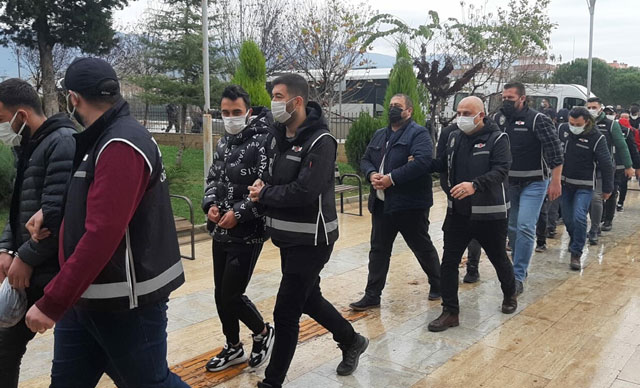 Operasyonun İzmir ayağında 30 şüpheli, gözaltına alındı. Şüphelilerin İzmir genelinde başta Ödemiş, Torbalı, Tire ve Bayındır ilçelerinde; halk üzerinde baskı kurarak haksız ekonomik gelir elde ettikleri, 'yağma', 'yaralama', 'kişiyi hürriyetinden yoksun kılma', 'silah kaçakçılığı' gibi birçok suça karıştıkları belirtildi. Şüphelilerin ev, iş yeri, otomobil ve üzerlerinde yapılan aramalarda ise ruhsatsız 8 tabanca, 4 tüfek, bir miktar mermi ve uyuşturucu madde ile çok sayıda senet ele geçirildi. Emniyetteki işlemleri tamamlanan 28 şüpheli, dün adliyeye sevk edildi. Şüphelilerden 11'i, çıkarıldığı mahkemece tutuklanırken, 6'sı da adli kontrol şartıyla serbest bırakıldı. 10 kişi, savcılık tarafından serbest bırakılırken, 1 kişi de ev hapsine alındı.