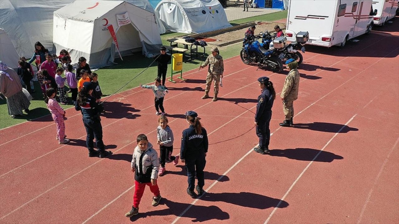 Jandarma, özellikle çocuklarda depremin izlerini silmek için onlarla yakından ilgileniyor. Kadın jandarma astsubaylar kız çocuklarıyla ip atlıyor, erkek personel de çocuklarla top oynayıp uçurtma uçuruyor.