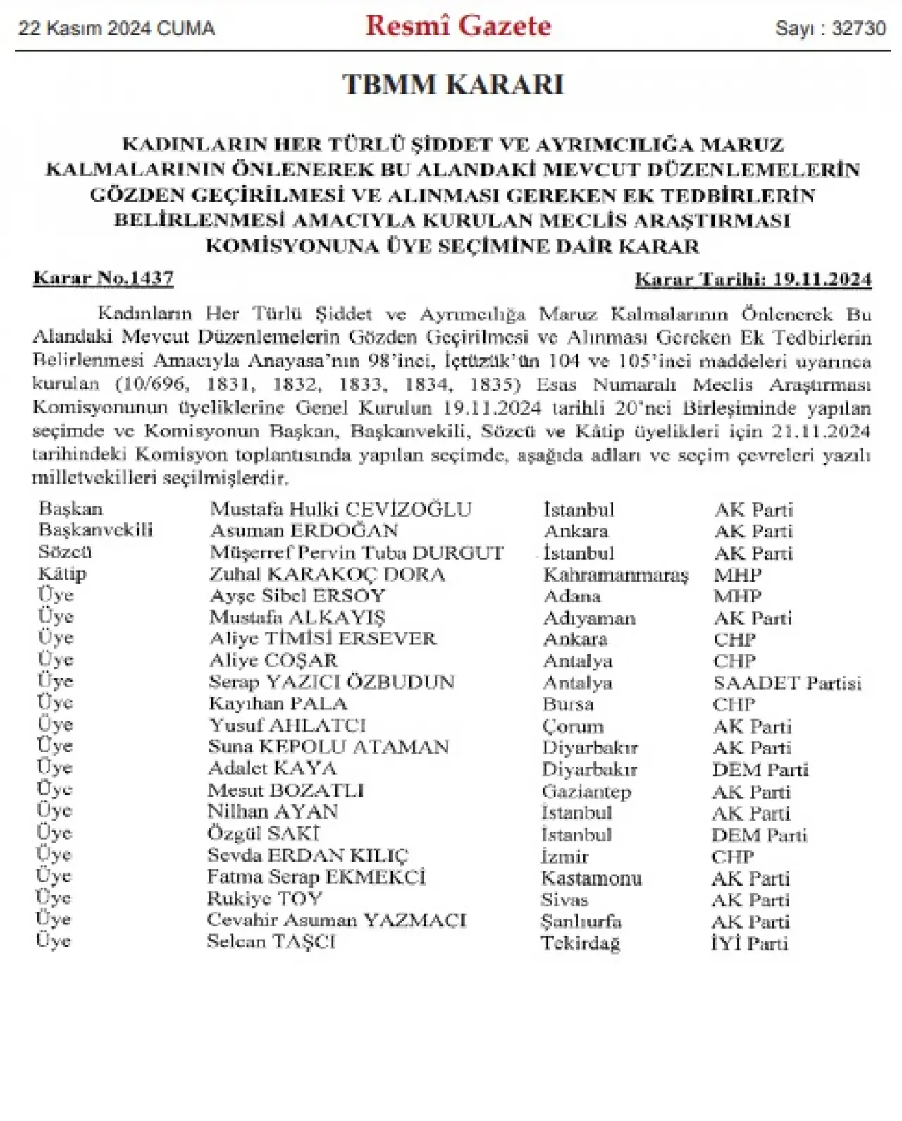 Türkiye Büyük Millet Meclisi (TBMM) tarafından alınan karara göre, Kadınların Her Türlü Şiddet ve Ayrımcılığa Maruz Kalmalarının Önlenerek Bu Alandaki Mevcut Düzenlemelerin Gözden Geçirilmesi ve Alınması Gereken Ek Tedbirlerin Belirlenmesi amacıyla Anayasa'nın 98'inci, İçtüzük'ün 104 ve 105'inci maddeleri uyarınca kurulmuş olan (10/696, 1831, 1832, 1833, 1834, 1835) Esas Numaralı Meclis Araştırması Komisyonunun üyeliklerine Genel Kurul’un 19 Kasım 2024 tarihli 20'nci Birleşiminde gerçekleştirilen seçimde ve komisyonun başkan, katip, başkanvekili ve sözcü üyelikleri için 21 Kasım 2024 tarihindeki Komisyon toplantısında yapılan seçimler Resmi Gazete'nin yeni sayısında yayımlandı.