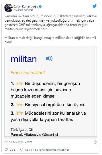 'Militan' kelimesinin sözlükteki tanımını paylaşan Kaftancıoğlu, "Partimin militanı olduğum doğrudur. İktidara tavsiyem, ülkeye demokrasi, adalet getirmek ve yoksulluğu bitirmek için çaba gösteren CHP militanlarıyla uğraşacaklarına terör örgütü militanlarıyla ilgilenmeleridir. Militan olmak değil hangi amaçta militanlık edildiğidir önemli olan." şeklinde dedi.