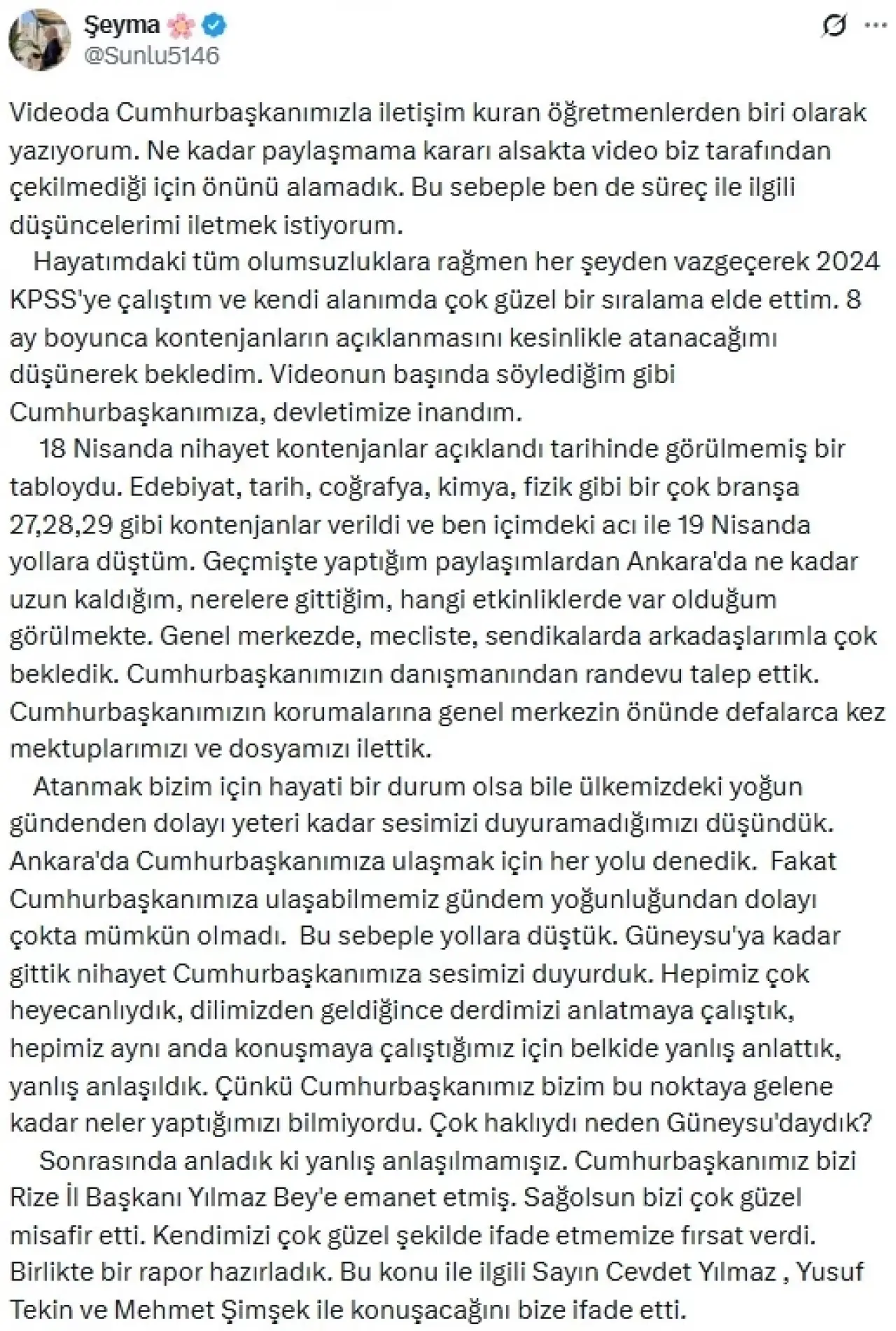 Cumhurbaşkanı Recep Tayyip Erdoğan’ın geçtiğimiz hafta Rize ziyareti sırasında görüştüğü bir grup öğretmen adayı, sosyal medyada “Ankara’da kapılar yüzümüze kapandı” ifadeleriyle büyük yankı uyandırmıştı. Bu iddiaların ardından, grupta yer alan öğretmen adaylarından birinin, olayın yanlış anlaşıldığını belirterek hesabını kapatması dikkat çekti.