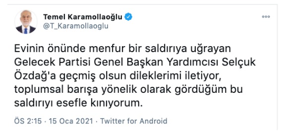 Karamollaoğlu Twitter hesabından yaptığı paylaşımda, "Evinin önünde menfur bir saldırıya uğrayan Gelecek Partisi Genel Başkan Yardımcısı Selçuk Özdağ'a geçmiş olsun dileklerimi iletiyor, toplumsal barışa yönelik olarak gördüğüm bu saldırıyı esefle kınıyorum." ifadesini kullandı.