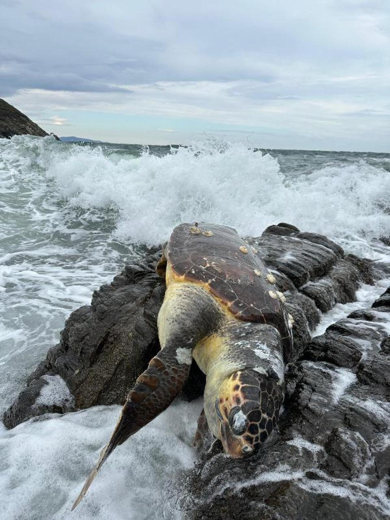 Hatice DAĞLI/ERDEK (Balıkesir), (DHA)- BALIKESİR'in Erdek ilçesindeki kayalıklara, öldüğü belirlenen nesli tehlike altındaki caretta caretta türü deniz kaplumbağası vurdu.