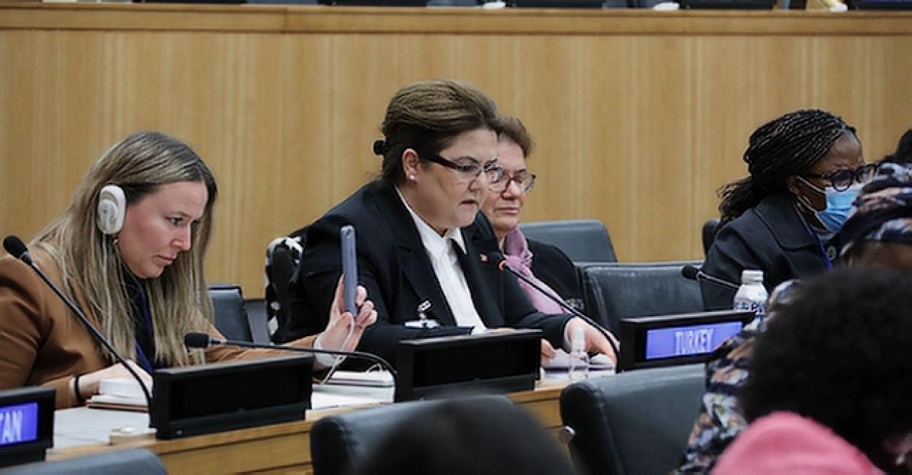 Bakan Derya Yanık, New York’ta gerçekleşen Birleşmiş Milletler (BM) Kadının Statüsü Komisyonu (KSK) 66’ncı oturumun “İklim Değişikliği, Çevre ve Afet Riskini Azaltma Politikaları ve Programları Bağlamında Kadın-Erkek Eşitliğini ve Tüm Kadın ve Kız Çocuklarının Güçlendirilmesini Sağlamak” başlıklı genel tartışmalar bölümünde bir konuşma gerçekleştirdi.