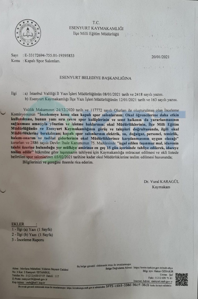 İstanbul Esenyurt'ta belediyenin bütçesinden yapılan spor salonları kaymakamlığın yazısı ile belediyeden alındı. Esenyurt Kaymakamlığı ilgili yazıyı Kaymakam Vural Karagül imzası ile 20 Ocak 2021'de Esenyurt Belediyesi'ne iletti.