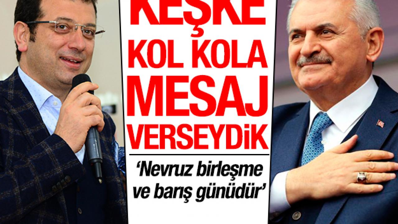 “Keşke bir araya gelseydik, el ele kol kola mesaj verseydik. Fırsattı bu. Nevruz birleşme günüdür, barış günüdür. Barıştan korkmayalım” diyen İmamoğlu, “Barış ve güzel dil bu ülkenin kurtuluşudur. Başka hiçbir kurtuluş vesilesi ve vasfı bulunamaz. Kucaklaşmak ve kol kola durmak, tatlı yarış öyle olur. Tatlı yarış bir birinden ayrılarak olmaz. Keşke gelseydi. Ama yine de sayın Yıldırım'ın nevruzunu kutluyorum” diye konuştu. Resmi programlarda iki adayın da saat 14.30'da Yahya Kemal Kültür Merkezi'ndeki nevruz kutlamalarına katılacakları belirtiliyordu.
