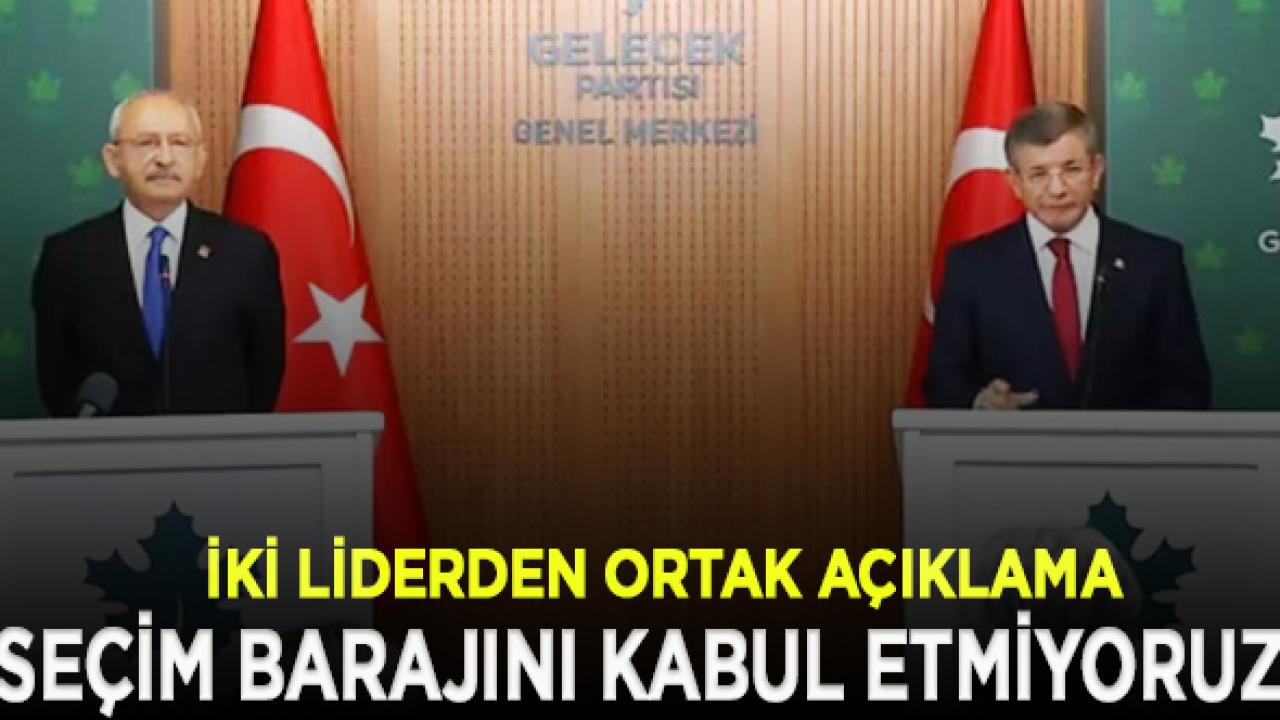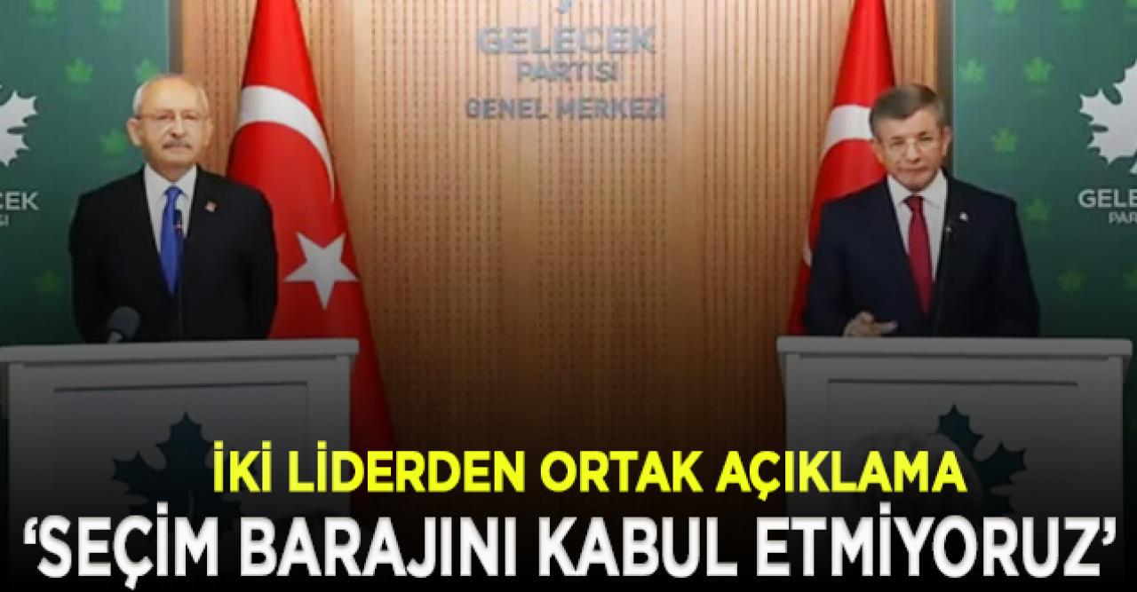 CHP lideri Kılıçdaroğlu ile Gelecek Partisi lideri Davutoğlu, ortak basın toplantısı düzenliyor. Bir hayırlı olsun ziyareti yaptıklarını açıklayan Kılıçdaroğlu 'Bu bir hayırlı olsun ziyaretiydi. İttifakla ilgili bir şey konuşulmadı. Yüzde 10 seçim barajını kabul etmiyoruz. Darbe hukukunu siyasi anlayışa da karşıyız' dedi. Davutoğlu da görüşme ile ilgili 'Bu ziyaretler umarız Türk siyasetinde yeni bir çizgiyi açar' diye konuştu.