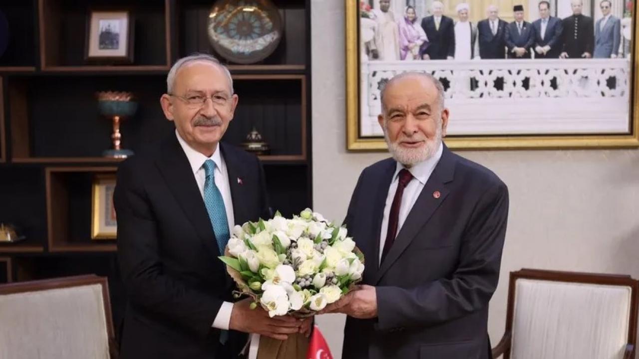 CHP Genel Başkanı Kemal Kılıçdaroğlu, geçtiğimiz hafta sağlık sorunları nedeniyle operasyon geçiren Saadet Partisi Genel Başkanı Temel Karamollaoğlu’nu ziyaret etti. SAADET Genel Merkezi’ndeki iki liderin ‘Geçmiş olsun’ buluşmasında CHP lideri Kılıçdaroğlu Saadet lideri Karamollaoğlu’na çiçek verdi.