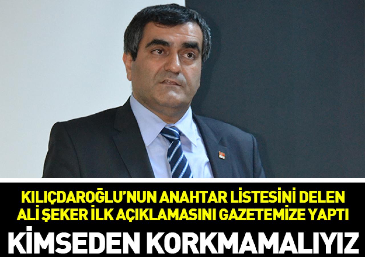 CHP Lideri Kemal Kılıçdaroğlu’nun anahtar listesini delerek 375 oyla PM’ye seçilen Ali Şeker ilk açıklamasını gazetemize yaptı. Şeker, “Bizler kendi inandığımız doğrulardan eminsek hiçbir şeyden ve hiç kimseden korkmamamız gerekiyor”ifadelerini kullandı.