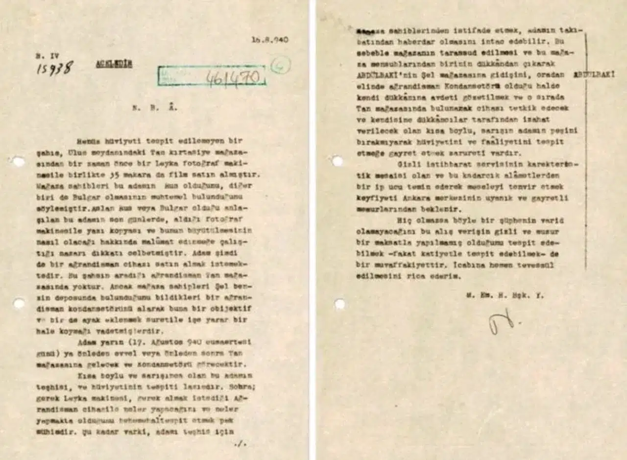 İstihbaratın radarına giren olay, Ulus Meydanı’ndaki meşhur Tan Kırtasiye’de başlıyor. Mağaza sahiplerinin ihbarına göre; kısa boylu ve sarışınca, Rus veya Bulgar olduğu tahmin edilen bir adam, bir "Leica" fotoğraf makinesiyle birlikte tam 35 makara film satın alıyor. Ancak şahsın asıl dikkat çeken faaliyeti, aldığı makineyle "yazı kopyası ve büyütme" tekniklerini öğrenmeye çalışması oluyor. Casusluk şüphelerini zirveye taşıyan hamle ise adamın bir "agrandisman" (büyütme cihazı) almak istemesiyle geliyor.