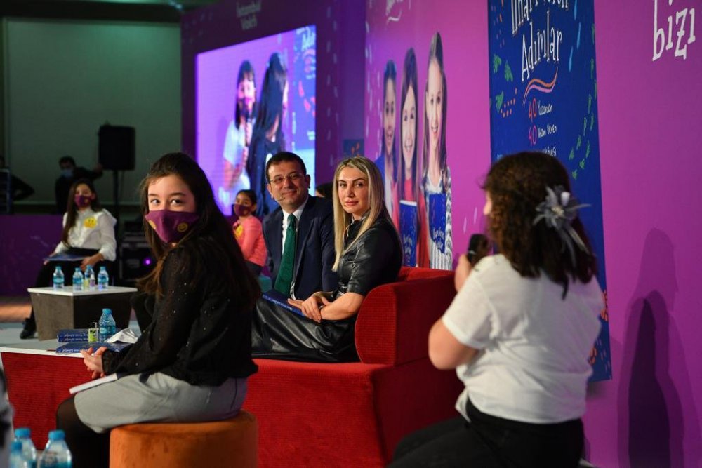 40 yazardan 40 ilham veren kadın hikayelerinin toplandığı “İlham Veren Adımlar" kitabını okuyan 15 kız çocuğuyla aynı sahneyi paylaşan İmamoğlu çiftinden ilk sözü Dilek İmamoğlu aldı. Büyüt Hayallerini projesine; eğitimi demokratikleşmek, özgürleşmek, gelişmek için en değerli araçlardan olduğu için başladıklarını söyleyen İmamoğlu, “Dezavantajlı grup olarak gördüğüm kız çocuklarının eğitim konusu benim için her zaman öncelik olmuştur. En büyük arzumuz, çocuklarımızın özgüvenlerini güçlendirmek, emek verip, cesaretle ‘ben de yapabilirim’ demelerini sağlamak. Duygularını harekete geçirmek ve doğru yoldan gidenlerin başarılarına ortak etmek" dedi.