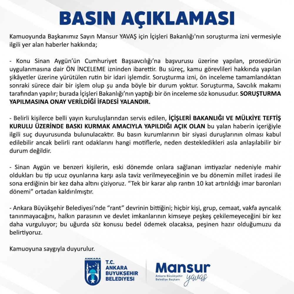 "Kamuoyunda Başkanımız Sayın Mansur YAVAŞ için İçişleri Bakanlığı'nın soruşturma izni vermesiyle ilgili yer alan haberler hakkında;