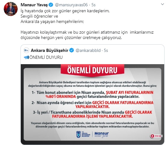 Başkan Mansur Yavaş, kararı "Hayatınızı kolaylaştırmak ve bu zor günleri atlatmanız için imkanlarımız ölçüsünde her gün yeni çözümler üretmeye çalışıyoruz." ifadesi ile paylaştı.