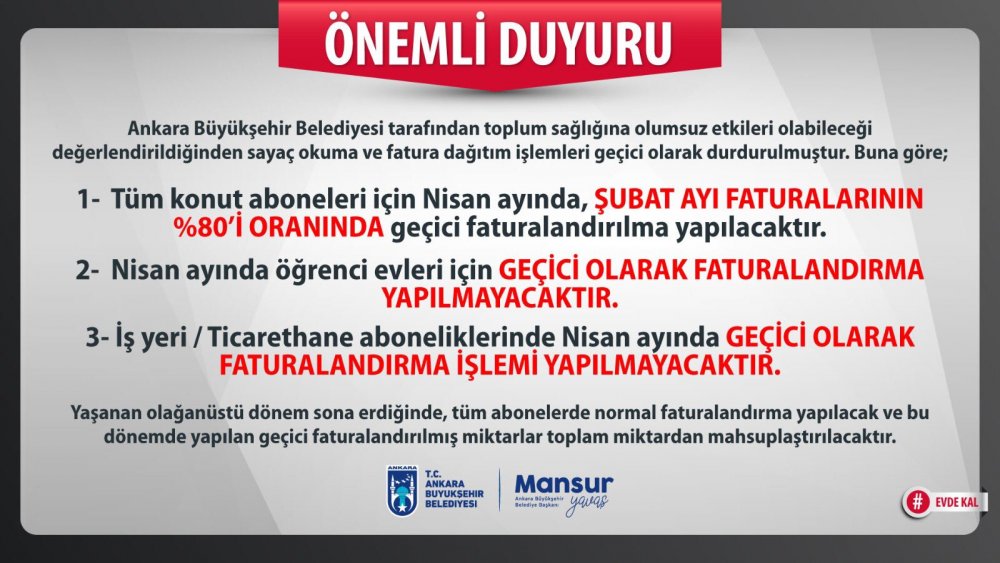 Önlem kapsamında konut aboneleri Nisan'da, Şubat ayı faturalarının yüzde 80'i oranında geçici fatura alacak. Öğrenci evleri ve iş yeri aboneleri ise geçici olarak faturalandırılmayacak.