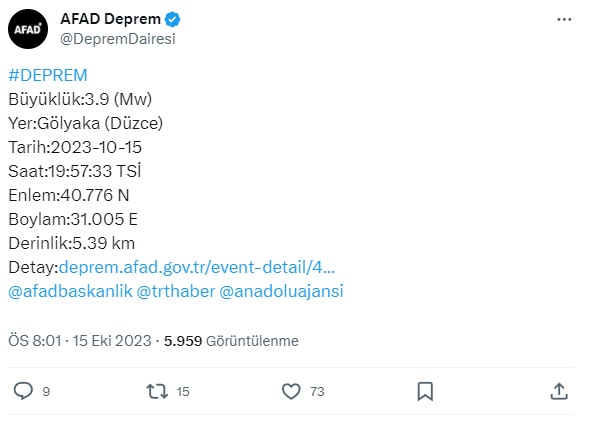 Afet ve Acil Durum Yönetimi Başkanlığı (AFAD) tarafından alınan web sitesindeki verilere göre Düzce'nin Gölyaka ilçesinde saat 19:57'de 3.9 büyüklüğünde deprem meydana geldi. Deprem yerin 5.39 km derinliğinde gerçekleşti.