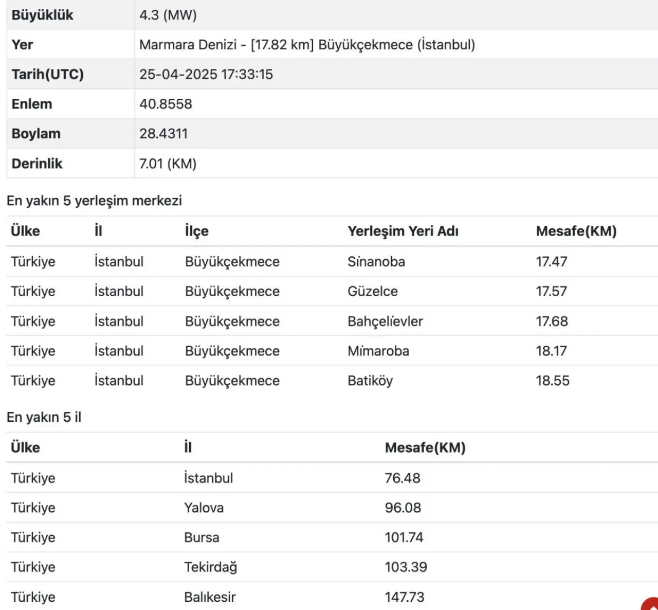 Afet ve Acil Durum Yönetimi Başkanlığı’nın (AFAD) verilerine göre, 25 Nisan 2025 tarihinde saat 20.33’te Marmara Denizi açıklarında, İstanbul’un Büyükçekmece ilçesine yaklaşık 17.8 kilometre uzaklıkta 4.3 büyüklüğünde bir deprem meydana geldi. Sarsıntı, yerin 7.01 kilometre derinliğinde gerçekleşti.