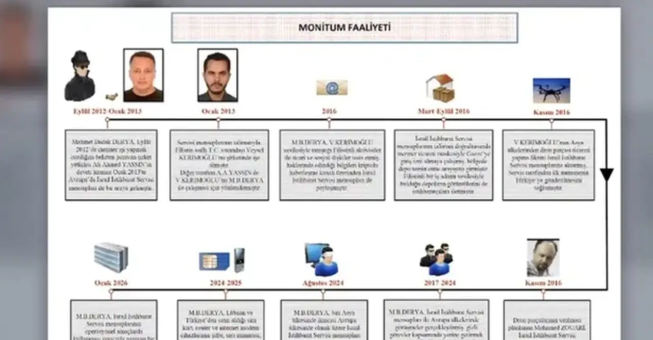 Milli İstihbarat Teşkilatı’nın (MİT) İsrail İstihbarat Servisi MOSSAD’a yönelik yürüttüğü MONİTUM operasyonu, Türkiye’de ticaret kisvesi altında kurulan uluslararası bir casusluk ağını gün yüzüne çıkardı. Operasyon kapsamında yakalanan Mehmet Budak Derya ve Veysel Kerimoğlu, mermer ticareti üzerinden istihbarat faaliyeti yürütmekle suçlanıyor. Soruşturma dosyası, drone suikastlarından kriptolu haberleşmeye kadar uzanan çarpıcı detaylar içeriyor.