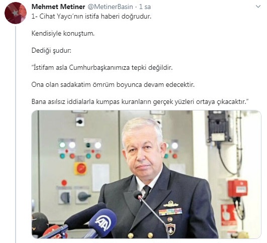 Deniz Kuvvetleri Komutanlığı Kurmay Başkanı Tümamiral Cihat Yaycı'nın Genelkurmay Başkanlığı emrine atanmasının ardından istifa etmesi gündem oldu. İstifanın ardından Eski Ak Parti'li Mehmet Metiner'den flaş bir açıklama geldi.