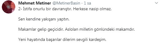 2- İstifa onurlu bir davranıştır. Herkese nasip olmaz. Sen kendine yakışanı yaptın. Makamlar gelip geçicidir. Aslolan milletin gönlündeki makamdır. Yeni hayatında başarılar dilerim sevgili kardeşim.