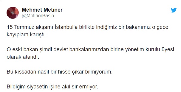 “15 Temmuz akşamı İstanbul’a birlikte indiğimiz bir bakanımız o gece kayıplara karıştı.