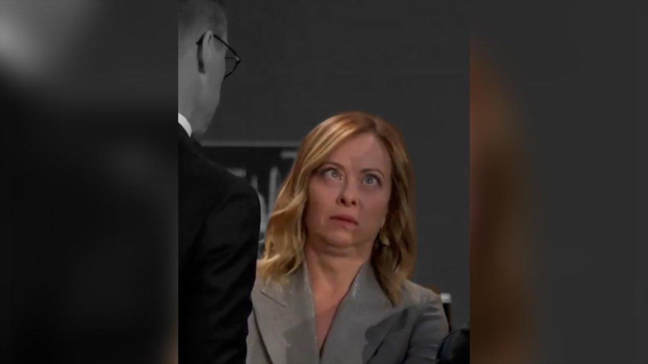 İtalya Başbakanı'nın gözlerini devirdiği ve yüzünü buruşturduğu o anlar kameralara yansıdı. Meloni'nin, kameraların kendisini çektiğini anlayınca yüz ifadesini düzelttiği görüldü.