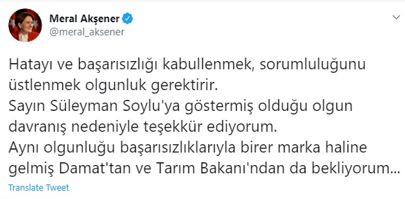 İYİ Parti Genel Başkanı Meral Akşener Bakan Soylu'nun istifa etmesinin ardından yaptığı açıklamada, "Hatayı ve başarısızlığı kabullenmek, sorumluluğunu üstlenmek olgunluk gerektirir. Sayın Süleyman Soylu'ya göstermiş olduğu olgun davranış nedeniyle teşekkür ediyorum. Aynı olgunluğu başarısızlıklarıyla birer marka haline gelmiş Damat'tan ve Tarım Bakanı'ndan da bekliyorum..."