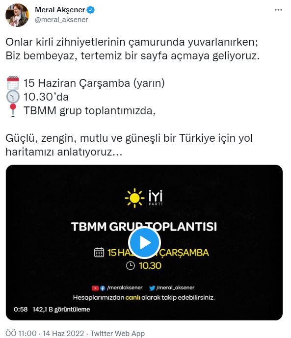 Akşener paylaşımında şöyle dedi; "Onlar kirli zihniyetlerinin çamurunda yuvarlanırken; Biz bembeyaz, tertemiz bir sayfa açmaya geliyoruz. 15 Haziran Çarşamba 10.30’da TBMM grup toplantımızda, Güçlü, zengin, mutlu ve güneşli bir Türkiye için yol haritamızı anlatıyoruz..."