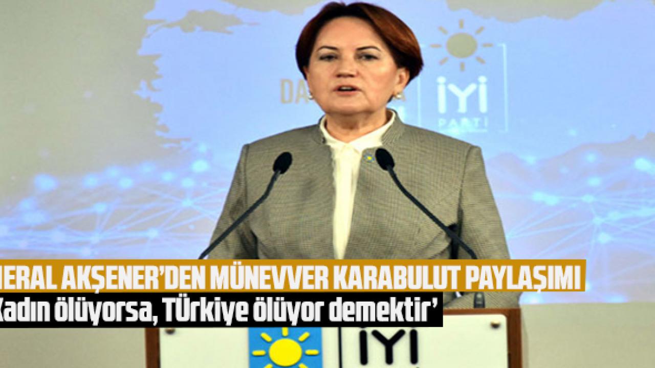 Twitter hesabından paylaştığı videoyla katledilişinin 12. yılında Münevver Karabulut'u anan İyi Parti Genel Başkanı Meral Akşener, "Münevver Karabulut kızımızı vefatının yıl dönümünde rahmetle anıyorum; Çirkin zihniyetleriyle kadına şiddeti meşrulaştıran kişilerle olan mücadelemden asla vazgeçmeyeceğim. Evlatlarımız yaşayacak, kadınlarımız huzur bulacak..." ifadelerini kullandı.