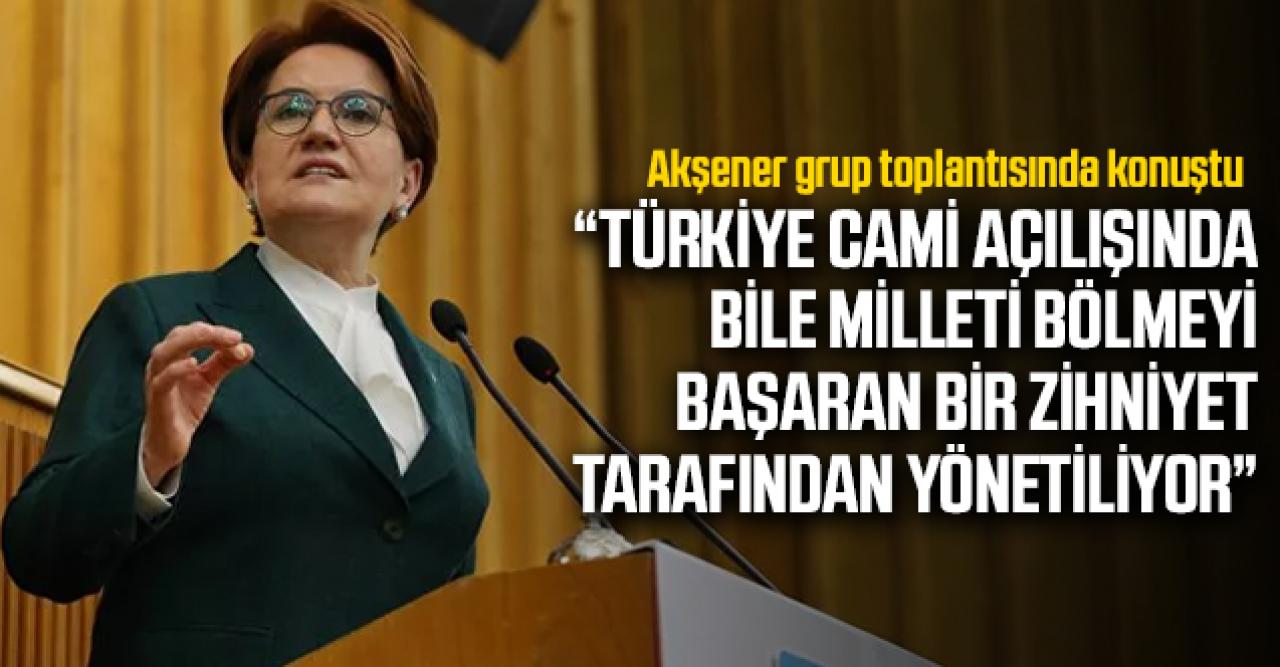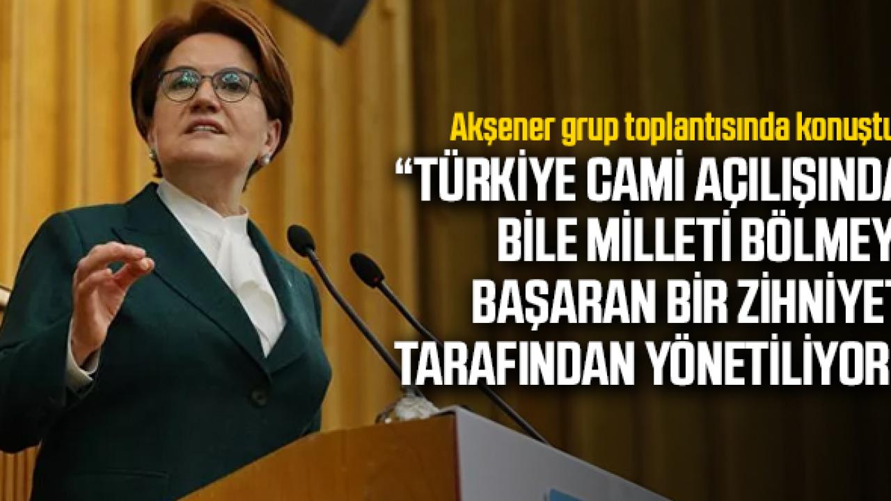İYİ Parti Genel Başkanı Meral Akşener, partisinin grup toplantısında açıklamalarda bulunarak; "Türkiye maalesef cami açılışında bile milleti bölmeyi başaran bir zihniyetle yönetiliyor" dedi.