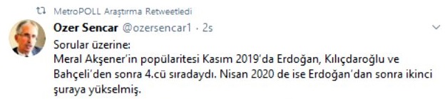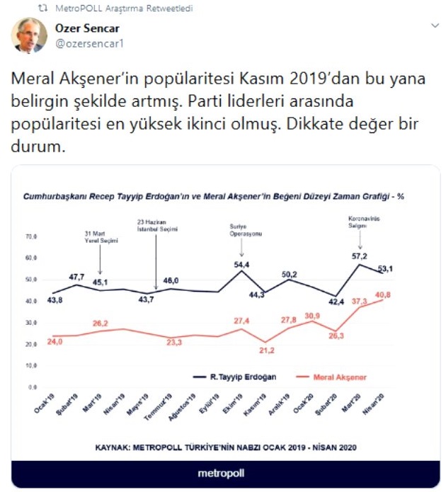 MetroPOLL Araştırma, Türkiye'nin Nabzı Nisan 2020 raporunu açıkladı. Şirketin kurucusu ve CEO'su Özer Sencar Twitter'dan Cumhurbaşkanı Recep Tayyip Erdoğan'la, İYİ Parti lideri Meral Akşener'in zaman içindeki beğeni düzeylerinin karşılaştırıldığı bir çalışmayı paylaştı. Nisan ayında yapılan çalışmaya göre, Cumhurbaşkanı Recep Tayyip Erdoğan ankette yüzde 52,1 alırken, Meral Akşener yüzde 40,8 oy aldı.