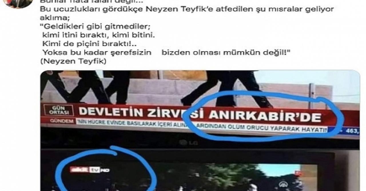 MHP’li Vahapoğlu mesajında, Akit TV’nin ekran görüntüsünü “Bunlar hata falan değil… Bu ucuzlukları gördükçe Neyzen Teyfik’e atfedilen şu mısralar geliyor aklıma; “Geldikleri gibi gitmediler; kimi itini bıraktı, kimi bitini. Kimi de piçini bıraktı!.. Yoksa bu kadar şerefsizin bizden olması mümkün değil!” (Neyzen Teyfik)” notuyla paylaştı.