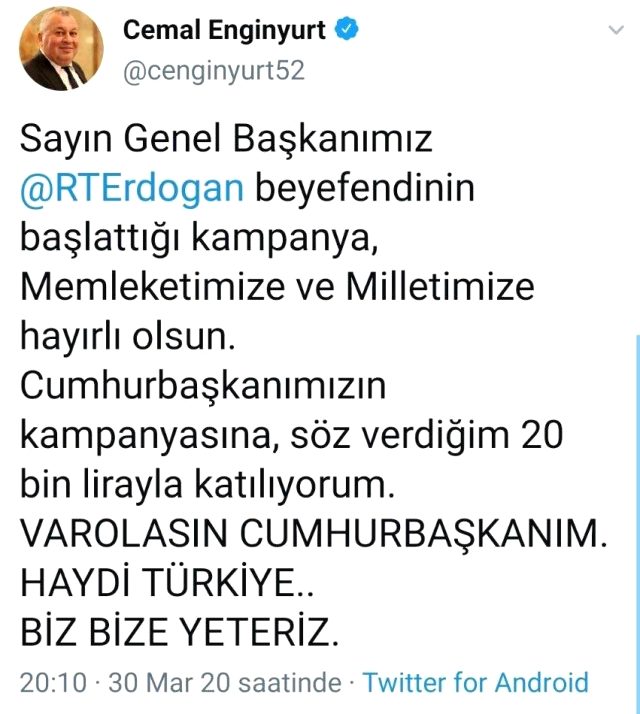Enginyurt, Twitter'da yaptığı paylaşımda "Sayın Genel Başkanımız Recep Tayyip Erdoğan beyefendinin başlattığı kampanya, memleketimize ve milletimize hayırlı olsun. Cumhurbaşkanımızın kampanyasına söz verdiğim 20 bin lira ile başlıyorum. Var olsun Cumhurbaşkanım, Haydi Türkiye. Biz bize yeteriz" diye yazdı.