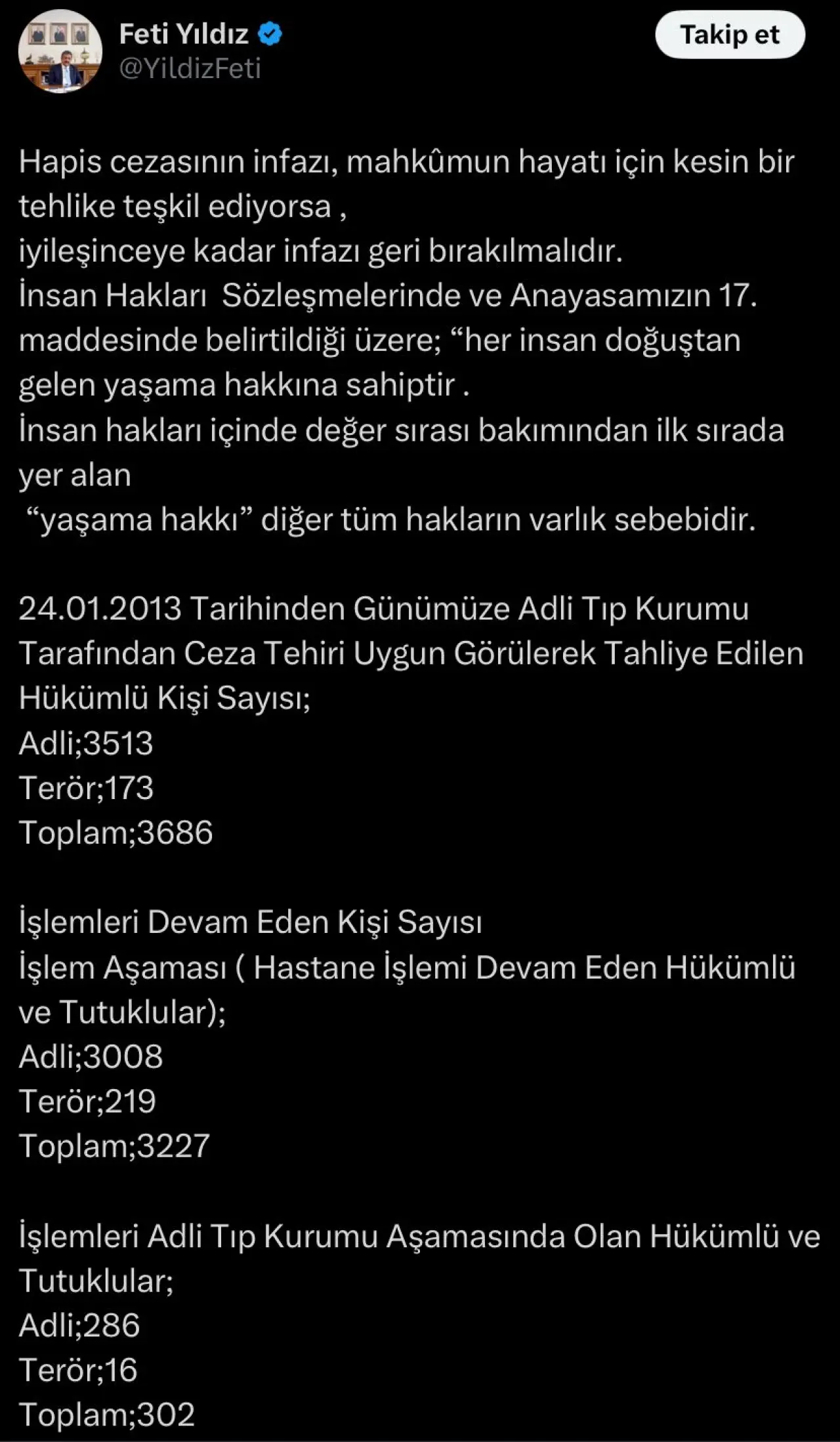 Feti Yıldız, son yıllarda hasta tutuklulara yönelik yapılan tahliyelere dair önemli rakamlar paylaştı. Buna göre:
