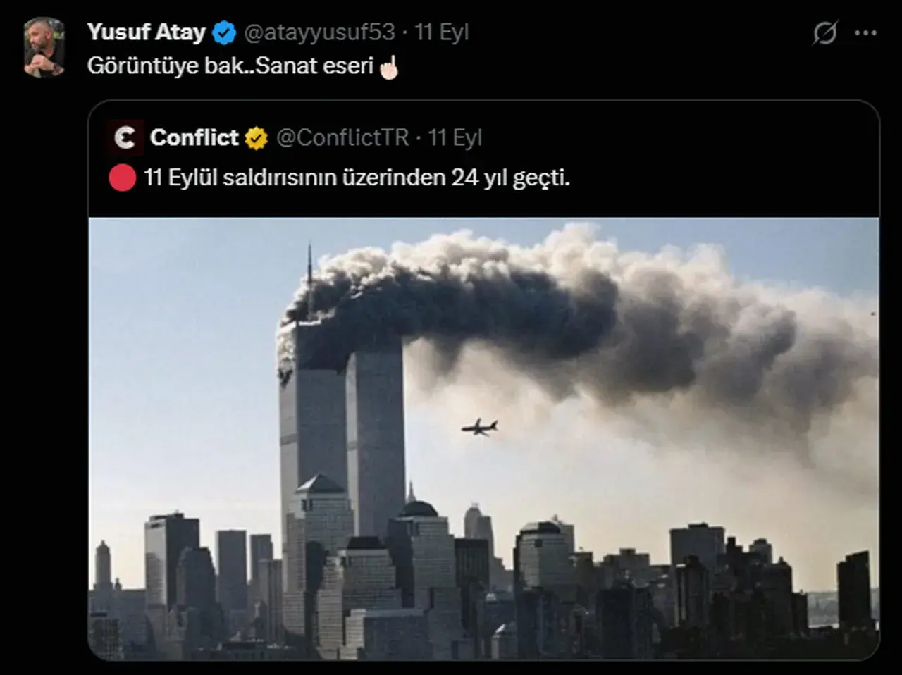 İddianamede en dikkat çeken unsur, Atay’ın X platformundaki bazı paylaşımları oldu. Atay’ın 11 Eylül saldırılarına dair yapılan bir haberi, “Görüntüye bak… Sanat eseri” sözleriyle alıntılaması dosyaya önemli delil olarak dahil edildi. ABD’de 2001 yılında gerçekleşen bu saldırıda 2 bin 977 kişi yaşamını yitirmişti.