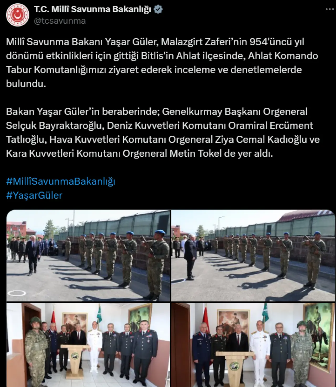 Milli Savunma Bakanlığı (MSB) sosyal medya hesabı X üzerinden yaptığı açıklamada, Bakan Güler’in, Malazgirt Zaferi’nin 954'üncü yıl dönümü etkinlikleri için gittiği Bitlis'in Ahlat ilçesinde, Ahlat Komando Tabur Komutanlığı’nı ziyaret ederek inceleme ve denetlemelerde bulunduğunu duyurdu.