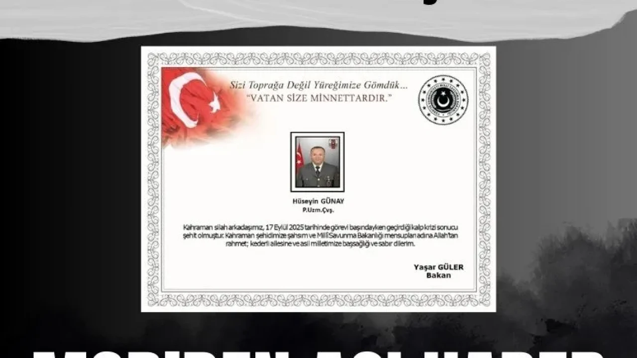 “Kahraman silah arkadaşımız, 17 Eylül 2025 tarihinde görevi başındayken geçirdiği kalp krizi sonucu şehit olmuştur. Kahraman şehidimize şahsım ve Milli Savunma Bakanlığı mensupları adına Allah’tan rahmet; kederli ailesine ve asil milletimize başsağlığı ve sabır dilerim.”