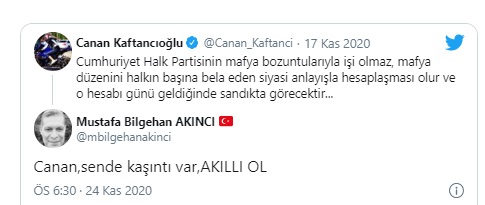 Kaftancıoğlu’nun, “Cumhuriyet Halk Partisi’nin mafya bozuntularıyla işi olmaz. Mafya düzenini halkın başına bela eden siyasi anlayışla hesaplaşması olur ve o hesabı günü geldiğinde sandıkta görecektir” sözlerini hedef alan Akıncı, sosyal medya hesabından "Canan, sende kaşıntı var, akıllı ol” diye yazdı.