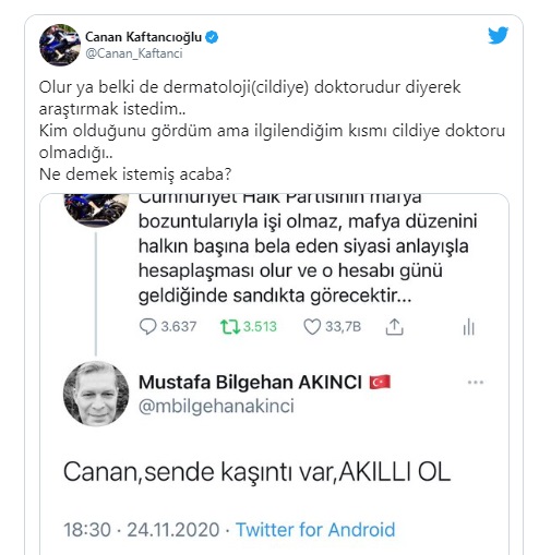 Söz konusu tehdide yanıt veren Canan Kaftancıoğlu ise Akıncı’ya, “Olur ya, ‘Belki de dermatoloji(cildiye) doktorudur’ diyerek araştırmak istedim.. Kim olduğunu gördüm ama ilgilendiğim kısmı cildiye doktoru olmadığı.. Ne demek istemiş acaba?” diyerek yanıt verdi.