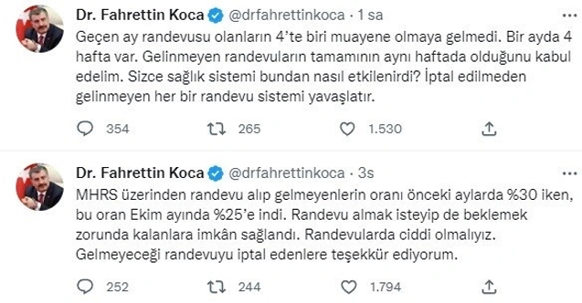 MHRS üzerinden randevu alıp gelmeyenlerin oranı önceki aylarda yüzde 30 iken, bu oran Ekim ayında yüzde 25’e indi. Randevu almak isteyip de beklemek zorunda kalanlara imkân sağlandı. Randevularda ciddi olmalıyız. Gelmeyeceği randevuyu iptal edenlere teşekkür ediyorum.