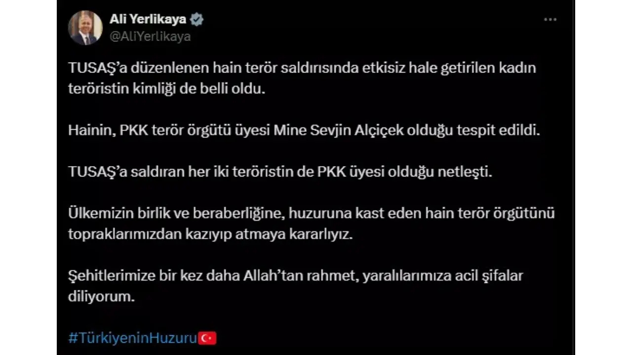 TUSAŞ'ta yaşanan ve 5 vatandaşın hayatını kaybetmesine, 22 kişinin yaralanmasına neden olan saldırı hakkındaki ayrıntılar yavaş yavaş ortaya çıkmaya başladı. Saldırganlardan birinin kimliği belirlenirken, bu kişinin PKK terör örgütü üyesi Mine Sevjin Alçiçek olduğu öğrenildi.