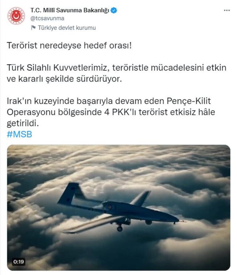 Bakanlıktan yapılan açıklamada, "Terörist neredeyse hedef orası. Türk Silahlı Kuvvetlerimiz (TSK), teröristle mücadelesini etkin ve kararlı şekilde sürdürüyor. Irak'ın kuzeyinde başarıyla devam eden Pençe- Kilit Operasyonu bölgesinde 4 PKK'lı terörist etkisiz hale getirildi" denildi.