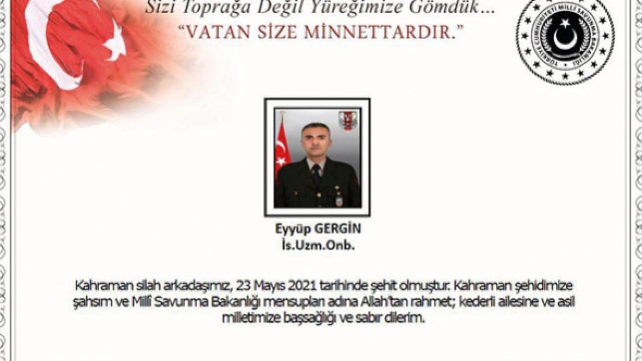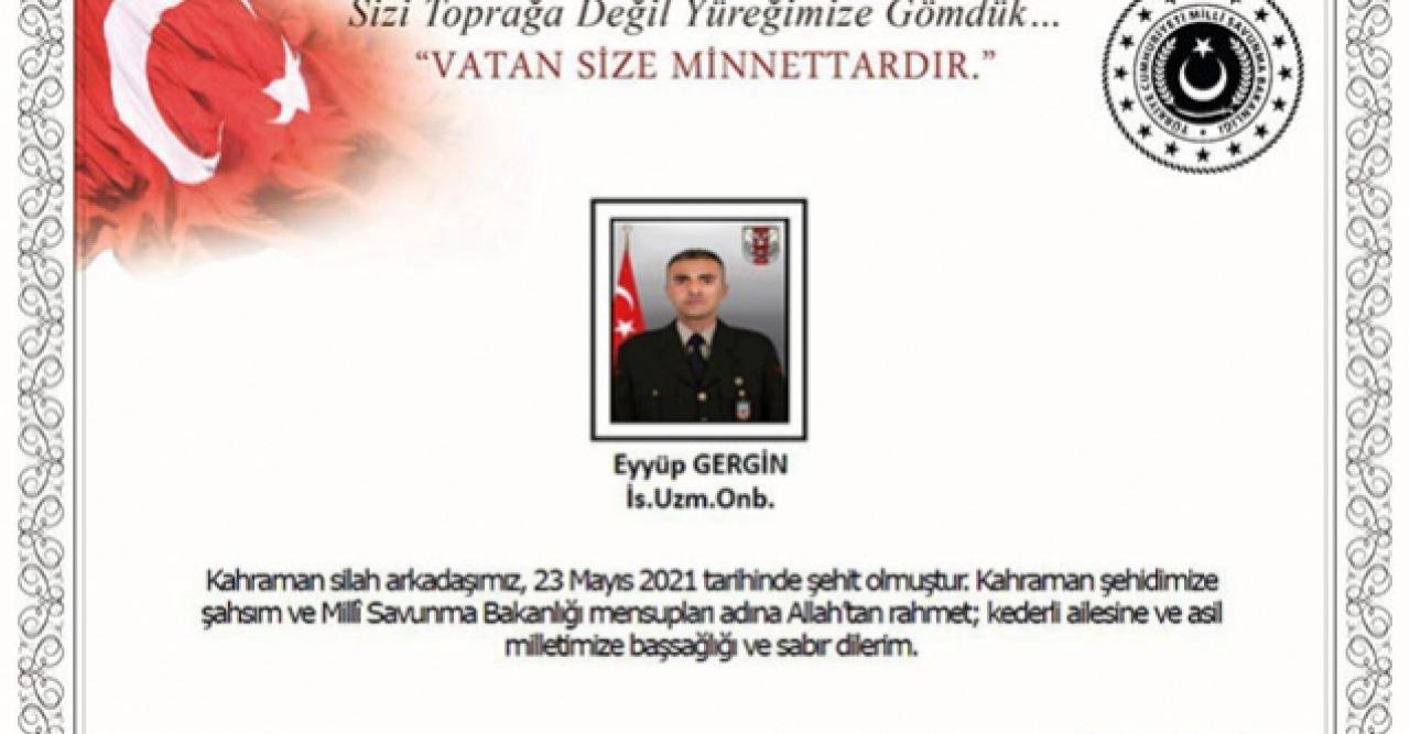 Bakanlıktan yapılan yazılı açıklamada, "Pençe-Yıldırım Harekâtı kapsamında 23 Mayıs 2021 tarihinde icra edilen havadan ikmal faaliyetinde bir kahraman silah arkadaşımız helikopterden inişi esnasında yaralanmış, derhal hastaneye sevk edilmiş, yapılan tüm müdahalelere rağmen kurtarılamayarak şehit olmuştur. Bizleri derin bir acı ve üzüntüye boğan bu olayda hayatını kaybeden aziz şehidimize Allah'tan rahmet, kederli ailesine, Türk Silahlı Kuvvetleri ile asil milletimize başsağlığı ve sabır dileriz" denildi.