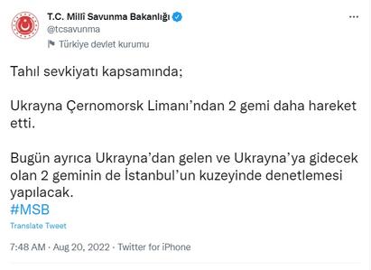 Bakanlığın Twitter hesaplarından yapılan açıklamada, "Tahıl sevkiyatı kapsamında; Ukrayna Çernomorsk Limanı’ndan 2 gemi daha hareket etti. Bugün ayrıca Ukrayna’dan gelen ve Ukrayna’ya gidecek olan 2 geminin de İstanbul’un kuzeyinde denetlemesi yapılacak" denildi.