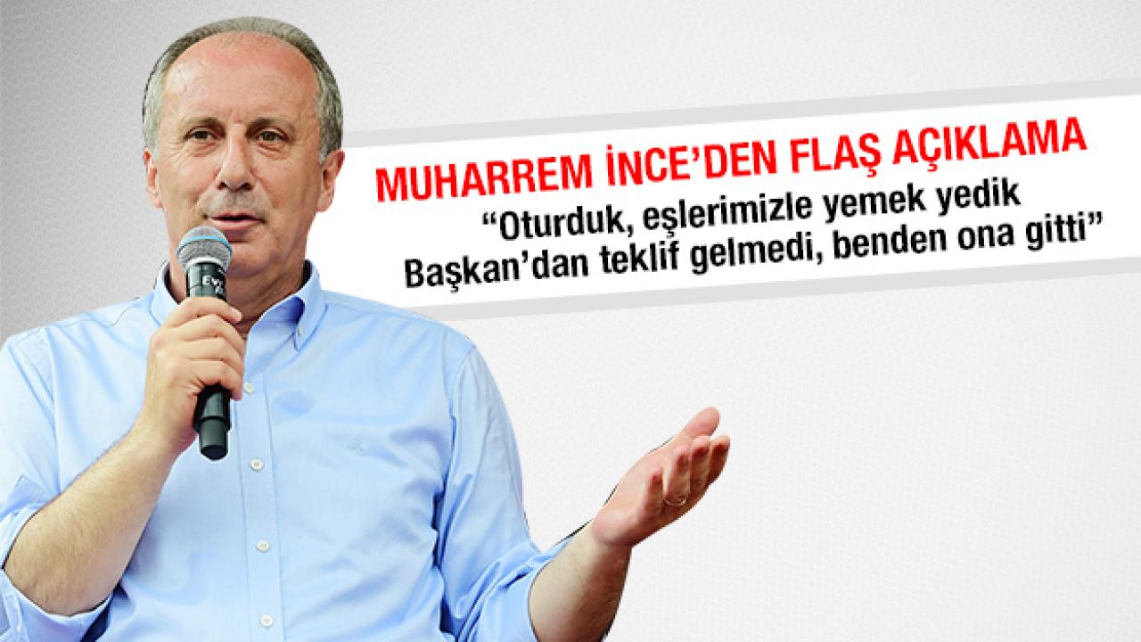 24 Haziran'da CHP'nin cumhurbaşkanı adayı olan Muharrem İnce, Genel Başkan Kılıçdaroğlu ile yaptığı görüşme hakkında açıklamalarda bulundu. Genel başkanlığa getirileceği iddia edilen İnce, "Kılıçdaroğlu'ndan bana teklif gelmedi ama benden ona bir teklif gitti.Yarış içinde olmayacağımı söyledim. Kendisine onursal başkanlık teklif ettim. Ben imza toplamayacağım, ama hayır derse örgüt kendisi çözecektir bu işi." dedi.
