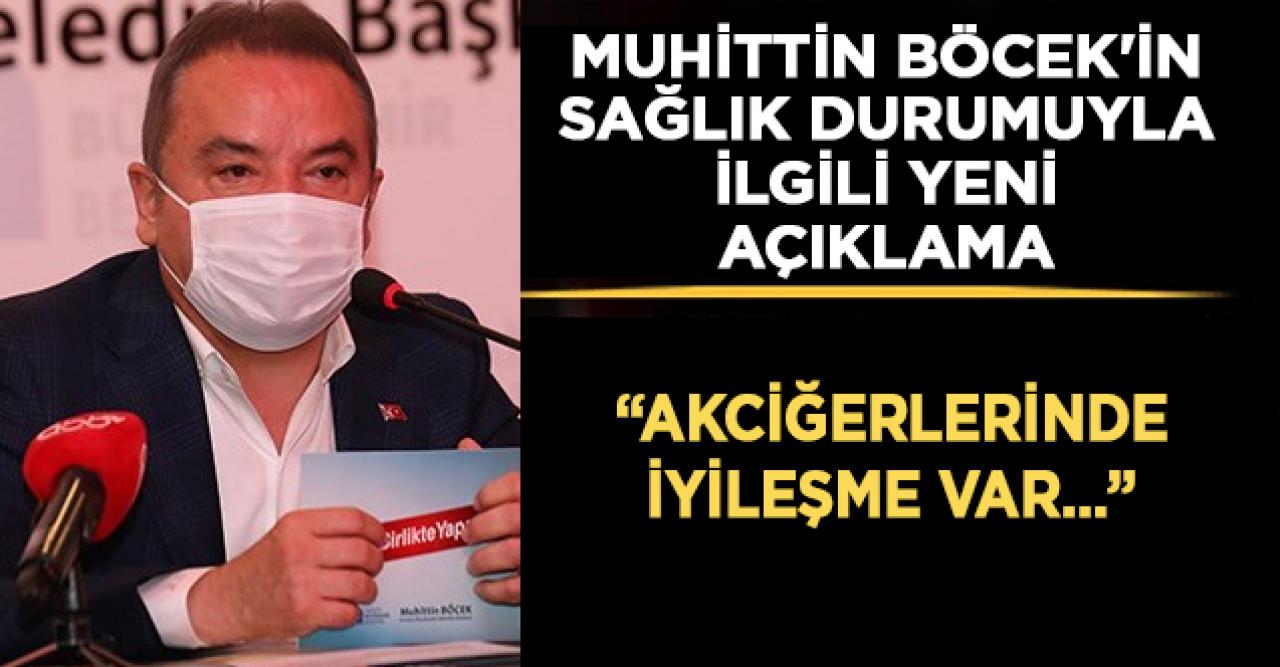 "Antalya Büyükşehir Belediye Başkanımız Muhittin Böcek'in 7 Eylül 2020 tarihinden itibaren yoğun bakımdaki takip ve tedavisi devam etmektedir. Son 24 saat içerisinde olumsuz giden herhangi bir süreç yaşanmamış olup, bugün çekilen tomografide akciğerlerinde iyileşme izlenmektedir."