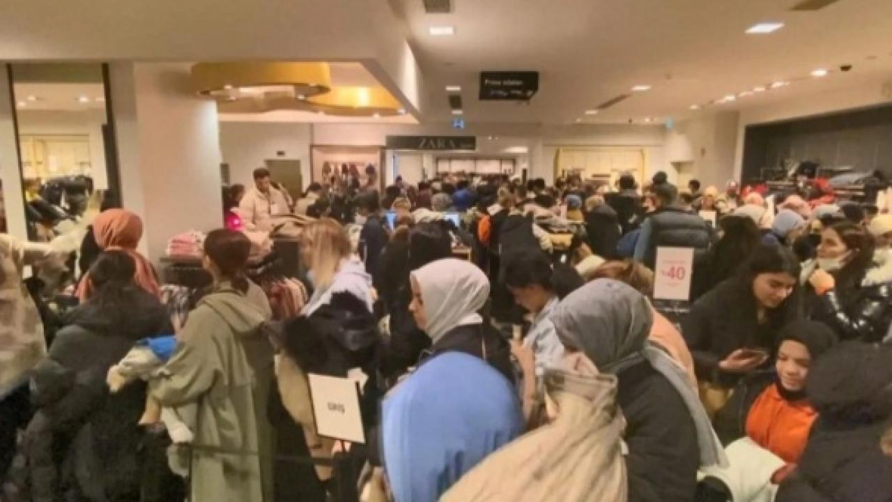 Kalabalıktan dolayı stantlardaki ürünler yerlere saçıldı, yoğunlukla mücadele etmeye çalışan mağaza çalışanlarının ise zor anlar yaşadığı görüldü. (NTV)